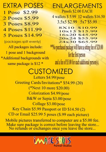 Our collages allows customers to have all their favorite pictures in one. The cost of a collage is based on size, number of pictures, and if any lettering is added. Each pose added to the picture is $3 and the lettering is $4.